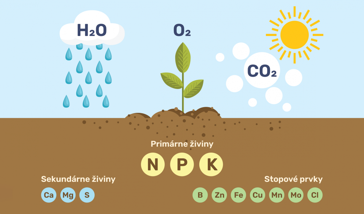 Až do 95 až 98% hmotnosti rastlín tvoria prvé tri prvky – uhlík (C), vodík (H) a kyslík (O). Našťastie sa o tieto prvky nemusíme starať, pretože rastliny si ich berú zo vzduchu a vody. Zvyšné prvky rastliny prijímajú z pôdy.